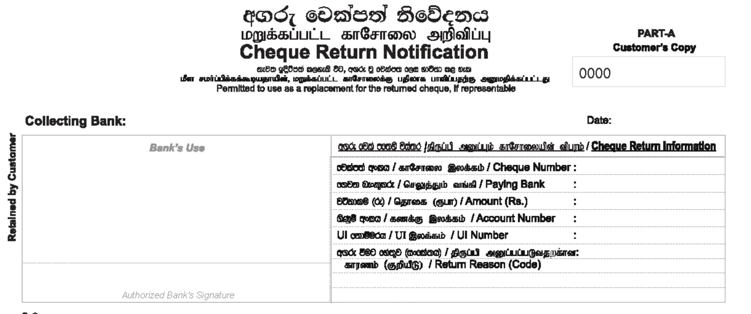 අගරු චෙක්පත් නිවේදනයේ A කොටස ගනුදෙනුකරු විසින් භාවිතා කිරීම සඳහා ලග තබා ගත යුතු වේ. මෙම කොටස තුළ, චෙක්පත් අංකය, ගෙවන බැංකුව, මුදල, ගිණුම් අංකය, UI අංකය, සහ අගරු වීමේ හේතු කේතය ඇතුළත් තොරතුරු විස්තරාත්මකව සඳහන් කර ඇත.