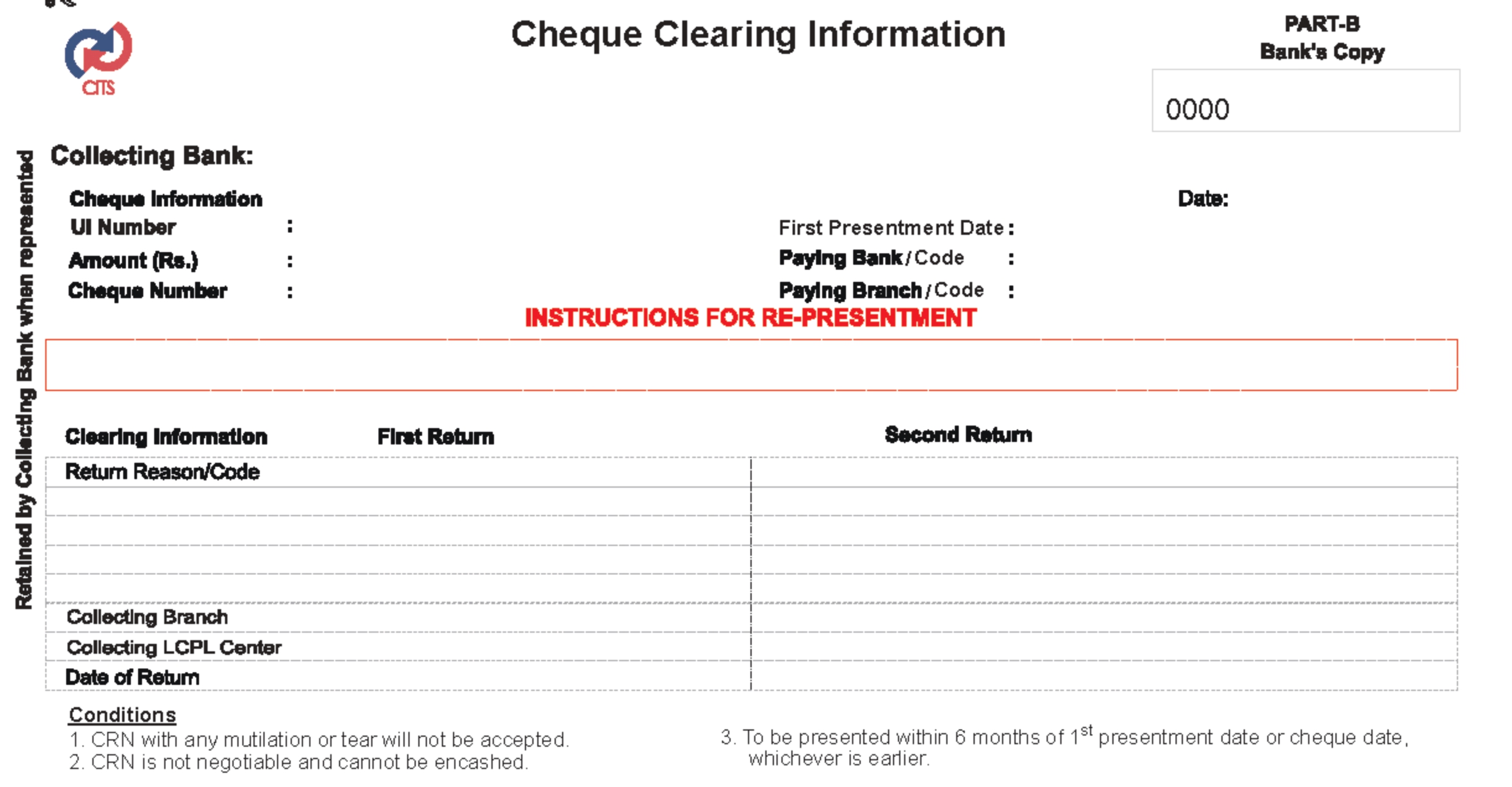 ஊஐவுளு இன் கீழ் காசோலைகள் ட்ராயி வங்கிக்கு வழங்கப்படாது. எனவே> காசோலையில் காசோலை திரும்பக் குறிப்பை எழுத முடியாது. எந்த காரணத்திற்காகவும் காசோலையை செலுத்த முடியாவிட்டால்> பணம் செலுத்தும் வங்கி பொருத்தமான காசோலை திரும்பக் குறியீட்டைத் தேர்ந்தெடுத்து செயல்படுத்த வேண்டும். மேலும் வாடிக்கையாளருக்கு ஒரு காசோலை திரும்ப அறிவிப்பு (CRN) வழங்கப்படும்.